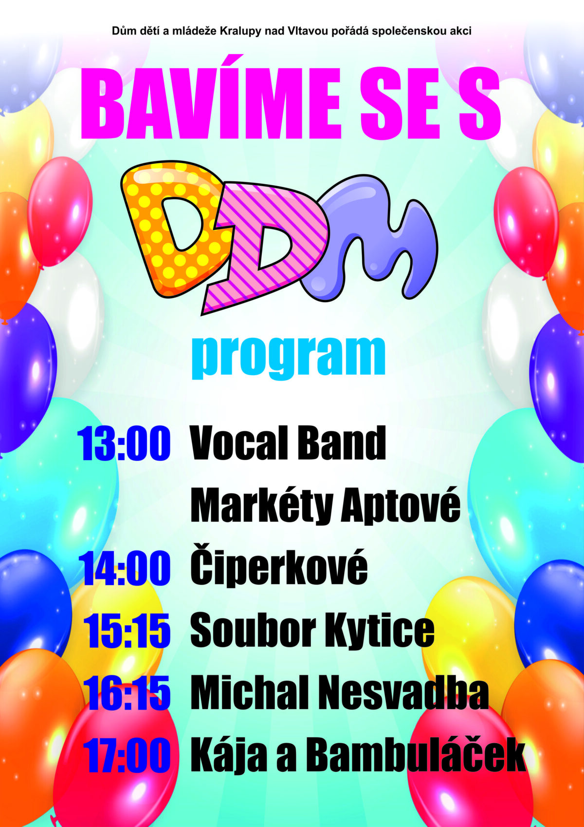 Těší se na vás Kája a Bambuláček, Čiperkové a Michal Nesvadba, bude tanec a zpěv, malování na obličej, modelování balónku, fotokoutek, klaun, cukrová vata, dobroty a zábava.