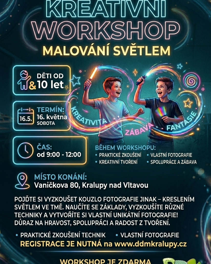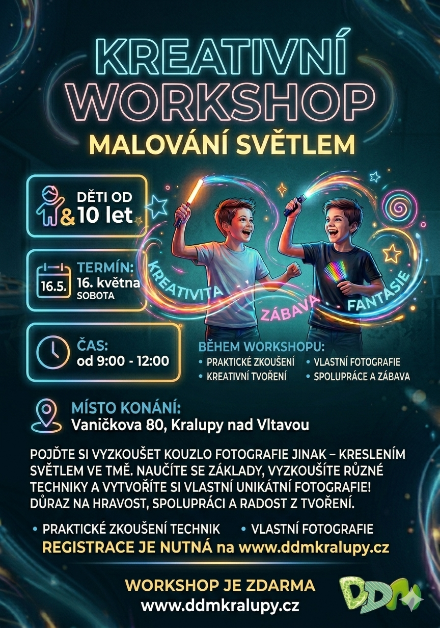 Nabízíme vám jedinečnou možnost kreativního workshopu Malování světlem pod vedením našeho lektora Pavla Pližingra. Budete mít možnost vyzkoušet si kouzlo fotografie jinak a sice kreslení světlem ve tmě. Předchozí zkušenosti s fotografováním nejsou potřeba, ale co je potřeba je registrace online na našich webových stránkách. Workshop je zdarma. ![]()